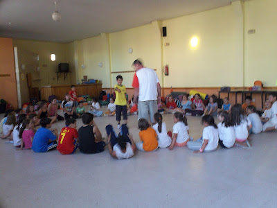 La luz de la mañana hace de despertador al entrar por los ventanales del pabellón. Los profes pensamos que les constaría levantarse, pero no fue así, unos fueron despertando a otros y comenzamos la etapa de aseo matinal y recogida del pabellón. Cuando las madres llegaron a las 8 de la mañana, ya estaba todo preparado para el desayuno. Ellas nos trajeron la leche calentita de sus casas y galletas, pastas... en definitiva, un desayuno de lujo.